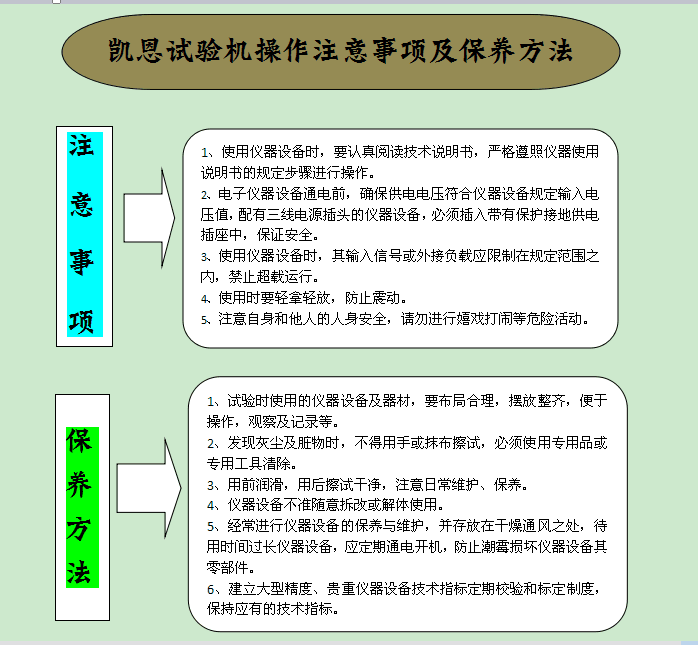 八、机械类仪器设备,使用前必须进行空载运转确保无故障后方可加载使用。用前润滑,用后擦试干净,注意日常维护、保养。